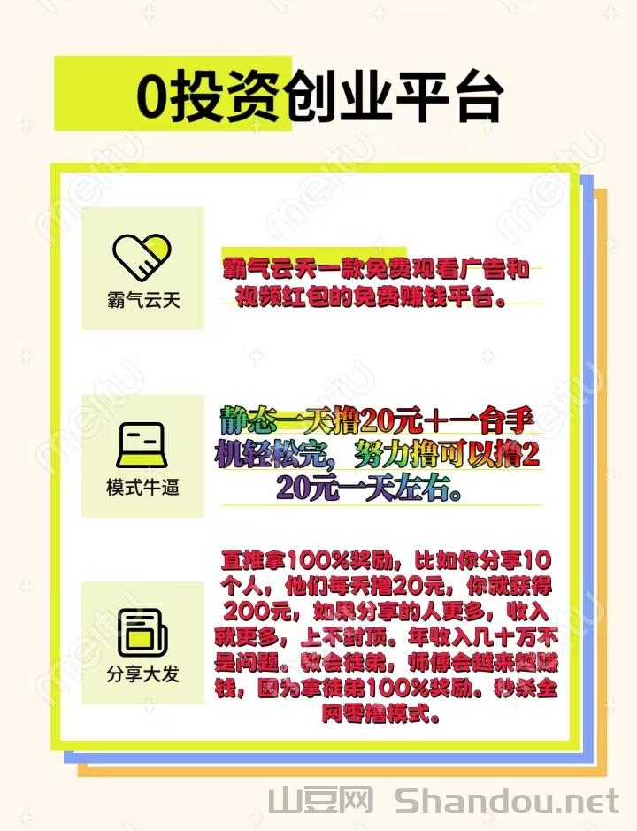 霸气云天零撸项目,看广告就能赚钱!单包最高5000火种,兑换太阳分红0.5-3元。地球收益0.2-0.5元,下级提成更给力。一台手机日赚220元不是梦,5000火种换太阳,1个太阳分红1元,每天最多撸220个太阳。邀请10人团队50人升级总裁,拿多元收益。直推100%奖励,10人500人送总裁身份,无限代10%+平级2%。复制100徒弟年入百万不是梦!零成本起步,多号多撸,上不封顶。快来加入,下一个百万富翁就是你!